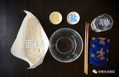 面粉、少许盐、少许油、一个空碗,一双筷子,一块抹布