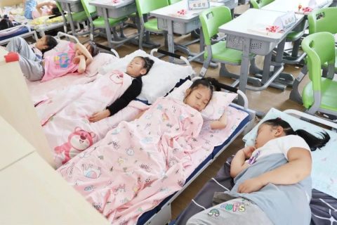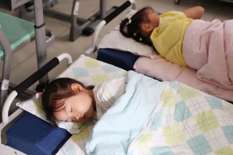 午休时间,老师带着孩子们来到午休室,他们开始学着整理自己的床铺。