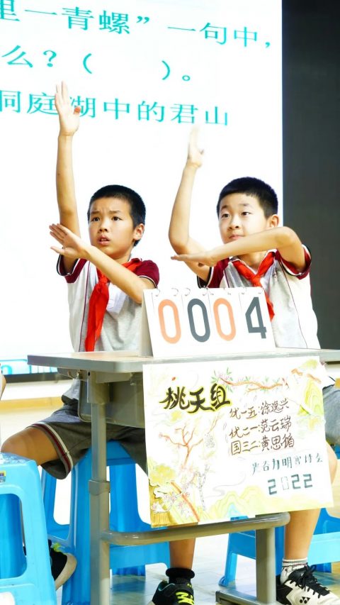 现场“飞花令”将赛诗会推向高潮,七个小组轮流背诗,小选手们你一句我一句,诗词越来越难,他们积累的诗词量令场下的嘉宾老师都惊叹不已,各班同学也在班级观看直播视频时为比赛选手鼓掌呐喊,场面十分热闹。