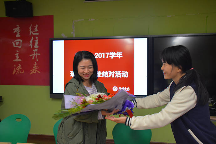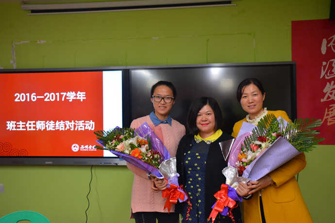 活动由德育处李春龙主任主持。李主任首先在仪式上宣读了导师带徒文件。明确了师徒双方的责任和义务,及相应的考核办法。同时,明确德育处将按照“协议”职责认真进行考核和评比,确保“传、帮、带”活动落到实处,取得实效。随后,由新老班主任纷纷上台签订结对协议,仪式上每一位徒弟签字完后都向师傅深深的鞠躬致敬并献花合影。