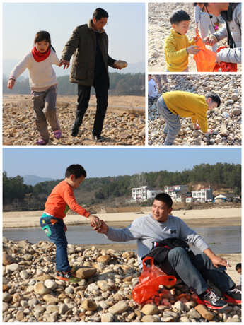 品尝过罗田特色吊锅美食之后,孩子们来到了河边美丽的金沙滩寻找最漂亮的小石头。此时冬日的暖阳高照,天空蔚蓝清澈,暖暖的微风阵阵,孩子们光着一只只小脚丫,肆意地奔跑在美丽的沙滩河岸,无比自由惬意!玩闹过后,孩子们一个个安静下来,仔细地像生怕错过宝藏一样、认真搜寻着他们心中最完美的石头!有的孩子捡到了心形石头如获至宝,有的把像面包的石头装进了袋子,还有的捡到了形似各种小动物的石块……小石头形态各异,让人不禁感慨大自然的鬼斧神工!在孩子们的眼中,每一块石头都珍贵无比!