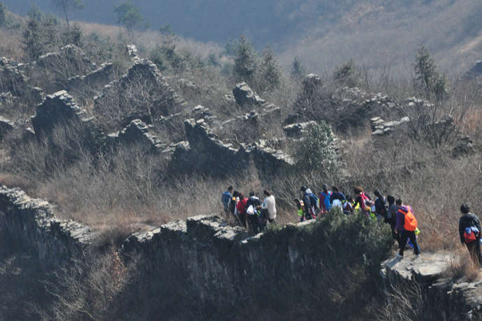 短暂的冬日急吼吼的催着太阳西落,很幸运的是,咱们这个互帮互助的大家庭都顺利的登上了山顶。参观片刻,也是时候下山了,从龙王庙下行也是一段惊魂路,山的坡度更加陡峭,需沿着茅草丛中的一条人踩出的小土路下山。走在这残垣断壁之间,时间仿佛停止在明朝,历史的痕迹深深的印在每一个古石之上。