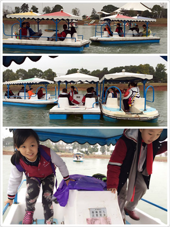 中午稍事休整后,天下起了蒙蒙细雨。冒着小雨,我们来到了湖边,分组登上了脚踏船。脚踏船让孩子真切地感受到了合作的重要性。因为只有两个人通力合作的时候,船才会快速地行使起来。所以每艘脚踏船上没有只闲坐或苦干的同学,大家都是相互帮助,共进退!