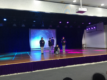 这是一场不可思议的比赛,小组凝聚力在这里落地生根。十八个节目,没有主持人串联,学生候场、上台、表演、下场,井然有序。比赛按八(1)班、七(1)班、七(2)班顺序每3个小组轮流一次,共六个轮次。节目前后没有老师的指指点点,没有规定时间的专项训练,完全由学生以小组为单位自选内容,自找时间排练。在活动开始之前的两天里,我们随处可见排练的学生,他们四个或六个一组,打印材料,下载音乐,制作PPT,好不热闹。小组凝聚力在这个时候显得无比重要,团结合作才能让团队取得成功的同时成全自己,这几乎是每一个孩子的感慨。在这个过程中,他们团结,他们紧张激动,可能也因为意见不同而有摩擦、冲突,但最终,他们微笑着站在了舞台上。