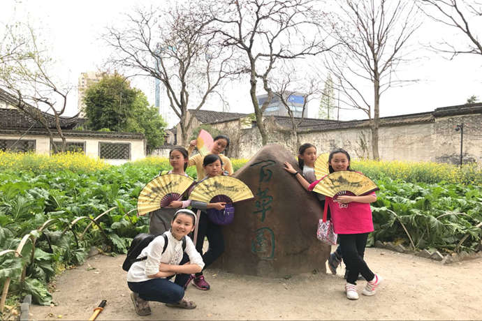 最后,我们终于来到了期待已久的鲁迅故里。鲁迅故里位于浙江省绍兴市鲁迅中路,由鲁迅纪念馆演化而来,如今已初具规模,不仅再现了鲁迅当年生活的故居、祖居、三味书屋、百草园的原貌,还可看到鲁迅祖居从未对外开放的西厢房和近期恢复的周家新台门、寿家台门、土谷祠、鲁迅笔下风情园等一批与鲁迅有关的古宅古迹,是立体解读中国近代文豪鲁迅先生的场所,是浙江绍兴的“镇城之宝”。而《朝花夕拾》作为“回忆的记事”文集,多侧面地反映了作者鲁迅青少年时期的生活,特别是前七篇反映了他童年时代在绍兴的家庭和私塾中的生活情景。来到鲁迅故里,孩子们从书中走到了现实,并跨越时空地和鲁迅先生的童年相遇了。在三味书屋里,他们寻找着鲁迅先生刻在书桌上的“早”字,想着抓苍蝇喂蚂蚁,学着寿镜吾老先生摇头晃脑地读书;在自由而快乐的百草园里,看着高大的皂荚树,摸着光滑的石井栏,回忆着美女蛇的故事,想象着自己也能有一只飞蜈蚣;在鲁迅先生的故居里,看着鲁迅先生祖母的画像会想起《二十四孝图》,看到猫会想起隐鼠、想起《狗·猫·鼠》、想起长妈妈,进而谈论起《阿长和<山海经>》;更不用说在迎神庙会里找无常了……如此参观下来,孩子们收获满满,也真正地体悟到了鲁迅先生文字里的情感,真是不虚此行!