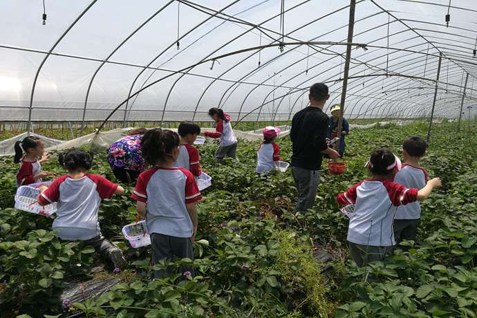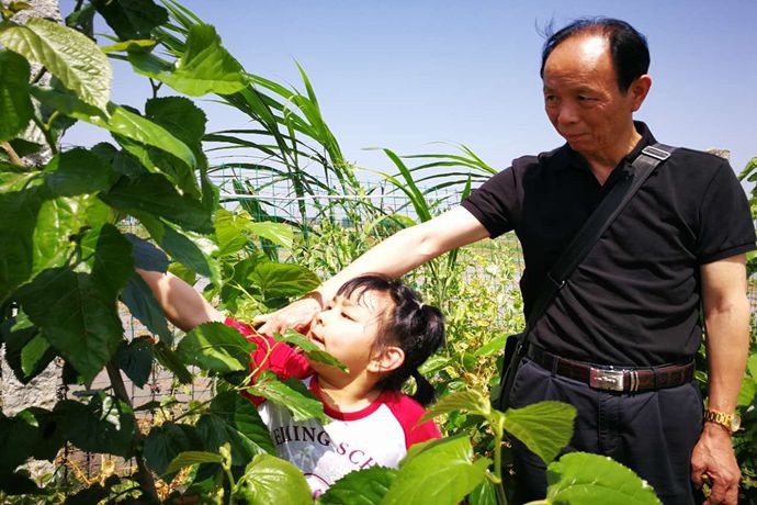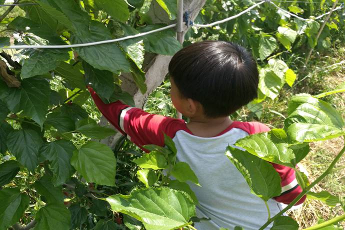 因为被园主告知这些桑树是无虫无药环境下生长起来的,桑椹摘下来后可以直接食用,孩子们早已受不了那香甜的诱惑,一个个都顾不得形象,吃得是满嘴狼狈,那景象让家长们忍俊不禁,却不仅没有责怪的意思,反而都不自觉地加入到了孩子们的采摘活动中。草莓园、黄瓜园、花菜园······一个一个园区下来,大家都不再拘谨——是被孩子们的天真快乐所感染,也是被土地丰富的馈赠所吸引。