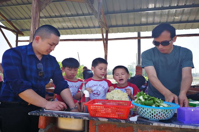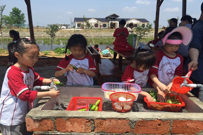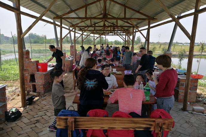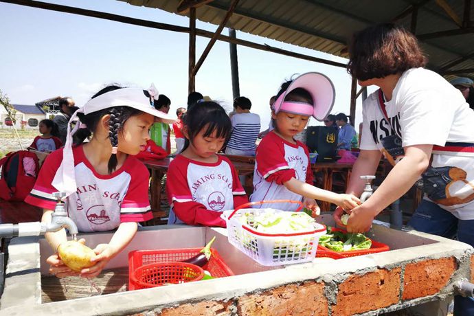 丰富的物质是有了,可园主说大家得自己解决午饭呢!大家以三个家庭为一组,围在各自分配的柴火灶前,简单分配任务后就开始了各自的工作——小朋友负责洗菜、摘菜、家长负责生火、切菜和炒菜。原以为会乱成一锅粥的午饭制作过程居然进行得有条不紊,最后制作出来的午餐居然出乎意科的好吃,这顿饭,孩子和家长们都吃得特别香。