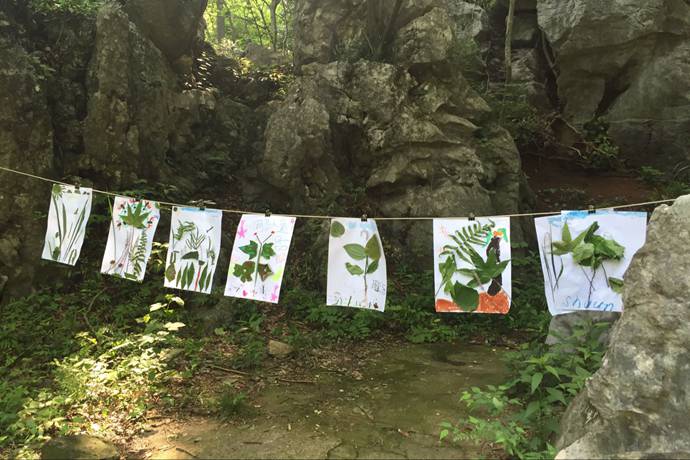 既然是户外体验,亲近大自然是必不可少的,平日生活在城市的孩子们少有融入自然的体验,一进山便尖不断:“哇!这里到处都是大虫子!”但孩子们的适应能力都很强,没过多久,好奇取代了胆怯,孩子们很快便习惯了一步一只虫的山间小径。所有的同学分成三组,轮流进行滑索道、攀树、制作植物粘贴画的活动。