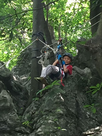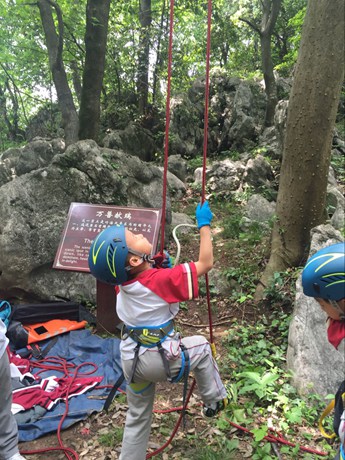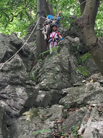 滑索道,技术难度并不大,但很考验胆量。要在距离地面大约8米的山间做个小小的穿越,孩子们略有些犹豫。勇敢的崔徐萍主动提出要第一个尝试。安全头盔、防护手套、防护衣,一切安全措施准备完毕,她跟着教练,兴奋地走上了索道的起点。当她面带微笑,大呼“再来一次”到达终点时,小伙伴们由衷的为她鼓掌。有了榜样,大家排着整齐的队伍,一个接一个地来到索道起点。有些小朋友紧张得张红了脸,有些小朋友由于害怕,大声的叫嚷着……在一声声“哇!你好厉害!”“真快啊!”的感叹中,最初的犹豫与恐惧烟消云散。空中飞行的刺激感让孩子们大呼过瘾。第一组滑索道的孩子们为了谁先上谁后上发生小争执,在家长们不做过多干涉的情况下,孩子们很快自己调整好心态,重新安排顺序,组里唯一的小男子汉李浩宇很有担当的告诉小伙伴:“我最后一个吧,我来压轴!”一旁的教练连连为这个宽容大度的孩子点赞!
