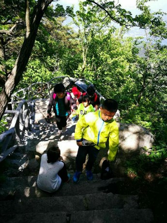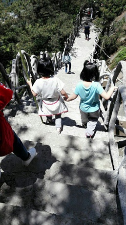 第二天大家准点集合。吃过早餐,我们的队伍兴致勃勃地出发了!一股不登顶峰不罢休的气势。登了不到100米,我们的队伍已经分成了三股——体力较好者、免强跟得上者和拖后腿者! 登在前面的已无踪迹,中间的能隐约听到说话声,我和三位妈妈两个孩子掉在了队伍的最后边!曾一度想放弃,选择坐索道上去,但想想我们的孩子都爬上去了,我们得做好榜样啊,于是我们互相加油鼓劲,搀扶着前进。期间桐桐和姗姗说什么也不干了,哭闹起来,肚子疼、头疼、要回家……反正不想登,什么病都来了。桂老师跑过来,通过拥抱,将老师的“超能量”“传给”了孩子(好吧,这招也管用,哈哈哈)这才让俩小家伙继续前行。