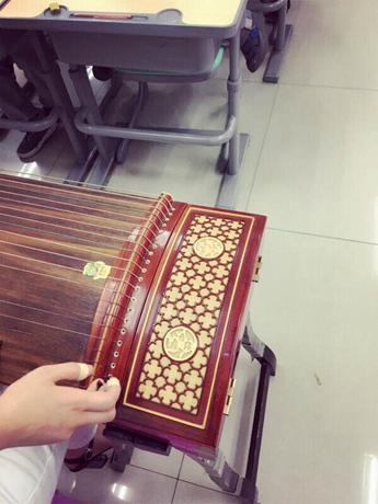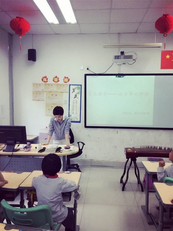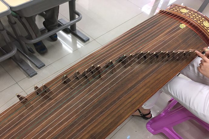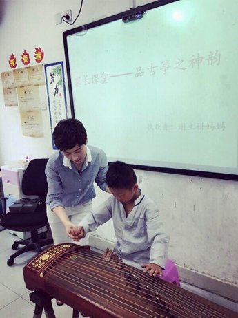 一桌,一琴,二十一弦。当一张真的古筝出现在同学们面前,大家一下就兴奋了起来。小心翼翼的,用小手摸一摸杉木制成的琴身,简单的拨动一下琴弦,教室里回荡的琴声就足以令同学们激动不已。这大概就是每个孩子血液中流淌着的,中华民族传统文化的基因吧。