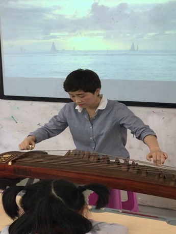 最令同学们难忘的,当然还是方玲老师的现场演奏,北派筝曲《渔舟唱晚》。这是一曲颇具古典风格的河南筝曲,它以歌唱性的旋律,形象的描绘了夕阳西下、晚霞斑斓,片片白帆、渐行渐远,渔歌四起,渔民们忙碌一天,满载而归,悠然自得的喜悦心情……大家听的如痴如醉.