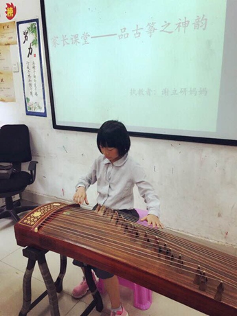 光谷为明学校优一一班的本次家长公开课,就是由本班谢立研同学的妈妈方玲老师讲授演奏的一节古筝课。