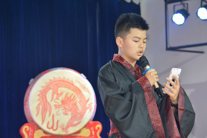 在篇章一《击鼓拜圣》中,两名学生礼官在庄严的鼓声中趋步上场,全体学生齐诵《论语》仁、义、礼、智、信首句,体现了我校传统文化特色。