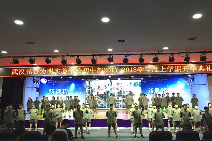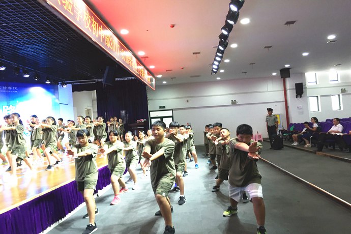 开学典礼在七年级新生整齐威严的军体拳表演中拉开了序幕。“苍山莽莽绿水汤,为明雏鹰鳞爪扬,南风猎猎旌旗卷。暑气熏熏军歌亮,口干舌燥似火烧,汗如雨下湿衣裳。立似青松意志坚,动如脱兔豪气扬。杀声震天慑敌胆,宝刀出匣夺日光,奇花初胎云失色,乳虎啸谷兽震惶。为明学子多奇志,勤学苦练本领强。今日练武抒壮志,明朝报国做栋梁。”(《为明学子夏日演武歌》——七(1)班班主任上官大勇老师书)看完孩子们的表演,家长们发出了阵阵掌声,为自己孩子在为期五天的军训生活中的进步与成长感到欣慰。