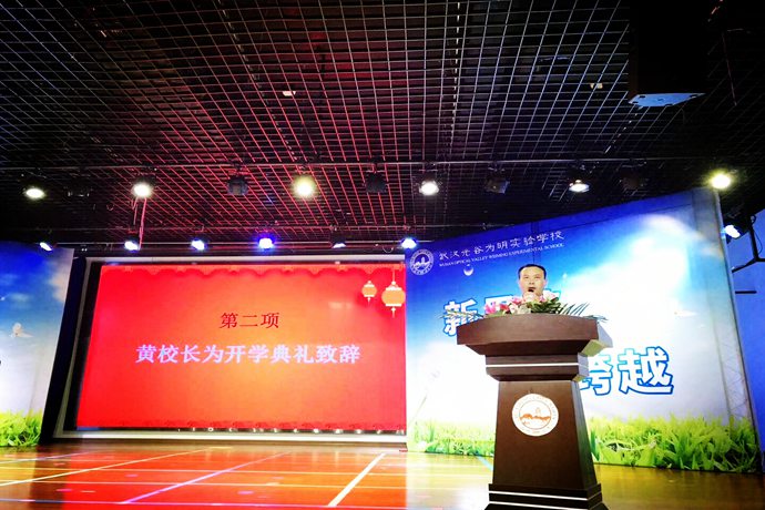 黄校长为此次开学典礼致辞,他首先对七年级孩子们在军训中的优秀表现进行了肯定和表扬,对八、九年级的孩子们在过去一年取得的成绩表示祝贺,希望孩子们在新的学期再接再励,不负学校和家长的期望,不负自己美好的青春。