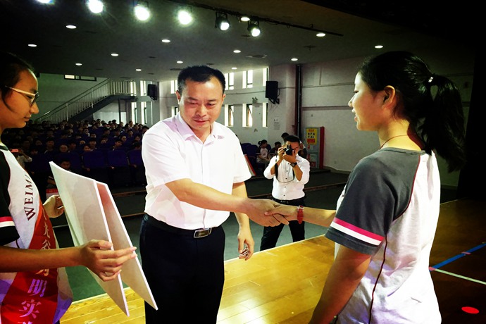 学部德育主任刘明刚老师为八(2)班孙瑞羲同学颁发了奖状,祝贺他暑期在2017年全国国际青少年跳棋竞标赛17岁组取得第7名的好成绩,特别荣誉奖属于他!刘主任还为七年级新生在军训中不怕吃苦、勤奋苦练的学生颁发“钢铁勇士”的荣誉奖状,祝贺他们成功地接受了一次洗礼与磨练,希望他们在初中阶段的学习和生活中不畏艰难,勇往直前。