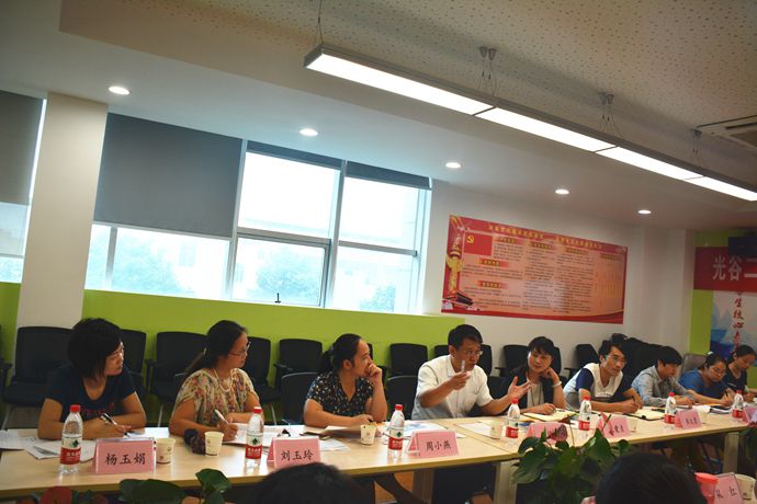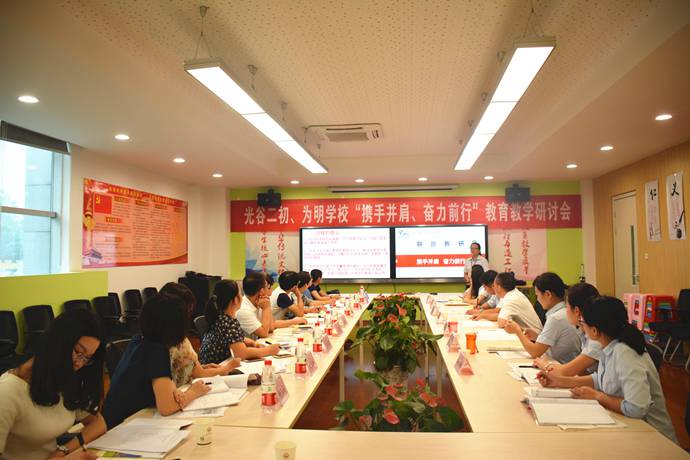 为进一步促进学校教育教学工作开展,突出以课堂教学为中心,为教师校际交流提供学习的机会。 9月19日上午九点,光谷二初王德昌校长带着学校教学副校长及全体教研组长共十人,到光谷为明学校初中部开展了联合教学研讨会。
