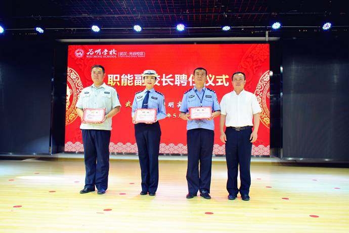 仪式上,黄东校长代表学校聘请东湖高新区同心派出所段中发警官为法制副校长,交警三中队韩玲警官为交通副校长,消防大队李星星警官为消防副校长,城管大队黄定斌队长为城管副校长。
