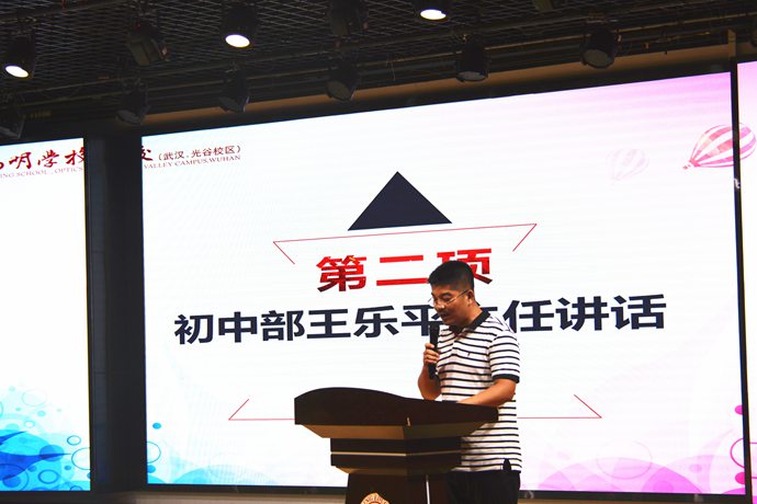 初中部王乐平主任激情致辞,他以饱满的热情与老师、同学们分享了“坚强”、“自觉”、“坚持”、“担当”这四个词,希望所有的同学在新的学期以良好的习惯为伴,与梦想同行,积极向上,不断成长!激昂而诚挚的号召为新的征程吹响了冲锋号!