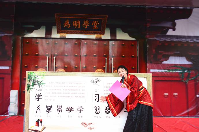 恭祭孔子,万世师表。面对教育家孔子,全体师生以及家长向孔子行崇敬礼,以表敬意,童子代表献祭芹菜和橙子祭祀文化圣人,寓意勤奋、诚实。
