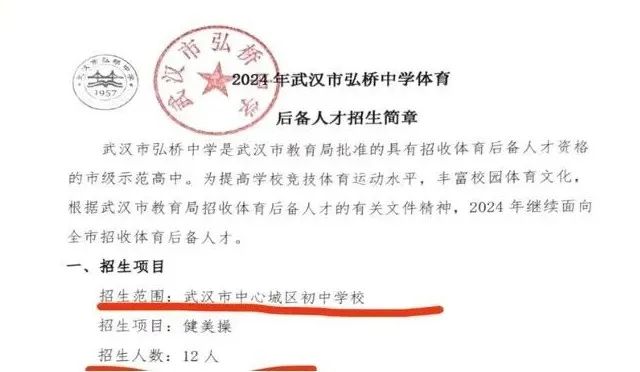 2024年武汉市弘桥中学体育后备人才招生简章中预计招收啦啦操、健美操项目后备人才12人。