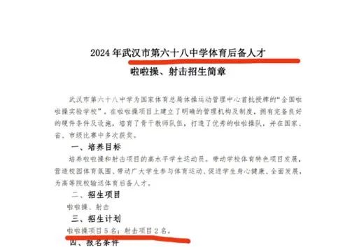 2024年武汉市第六十八中学体育后备人才招生简章中预计招收啦啦操、健美操项目后备人才5人。