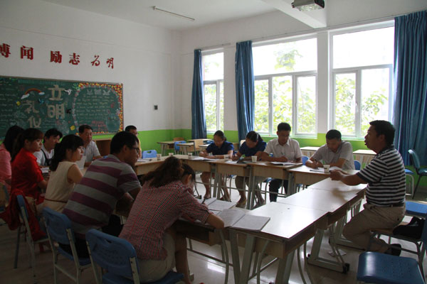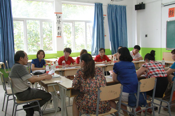 2013年8月27号上午北大附中初中部全体英语老师与武汉市教科院中教室英语科主任,市学科带头人钟爱琳老师进行了一次深刻的交流。在这次交流中钟老师对初中英语课堂教学发表了独道的见解,我们都受益匪浅。他一针见血地指出我们教学中存在的实际问题并提出解决的办法,并强调了要上好一节课,一定要做到真正备教材、备学生、备教法,会向学生提问,帮助学生学会学习,不要给学生增添多余的负担。他还建议我们及时了解中考动态,深入学习课程标准,并鼓励我们要不断提升自己。他亲切温和的态度和深入浅出的指导给所有的老师都留下了深刻的印象。