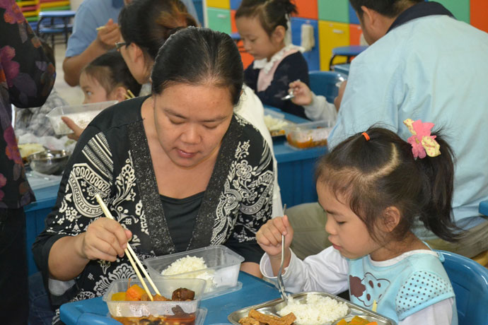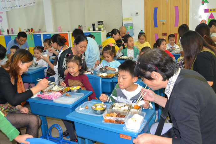 在上午充实的课程结束后,午餐时间到了。经历了一个月的习惯培养,大部分学生都养成了良好的自主用餐习惯:清理桌面、洗手、帮助分发、用餐、回收餐具、抹嘴擦手、检查清洁,一气呵成。学校也为家长们提供了免费的午餐,事后很多家长表示:午餐菜品丰富,搭配健康,咸淡适宜。稍事休息后,在古典乐声的伴随中,同学们开始练习写字,依此养成正确的坐姿习惯,培养优雅的书香气质。