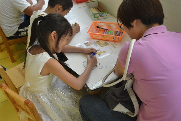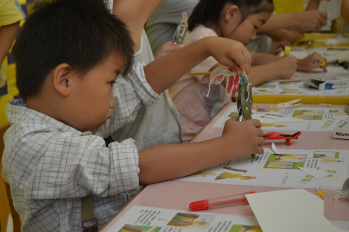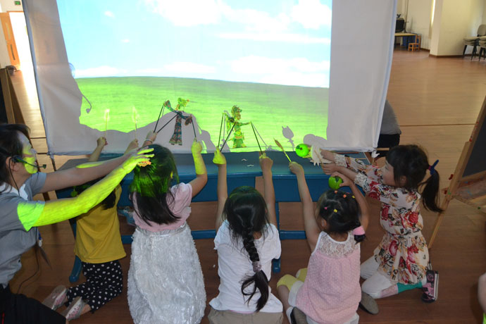 来自湖北云梦的皮影艺术家秦礼刚为此次主演,被誉为“皮影王”的秦先生以一身扎实的功底、一口圆熟的唱腔演绎了《鹤与龟》、《武松打虎》、《御花园降妖》、《孙悟空大战牛魔王》四场经典戏曲。人物形象之精妙令人拍手称赞,小朋友们都看得目不转睛,家长们也仿佛回到孩提时代,重温当年的光影岁月。演出结束后孩子们早已跃跃欲试,想要到神秘的后台一探究竟,最后以每十个小朋友为一组的方式开始体验活动。