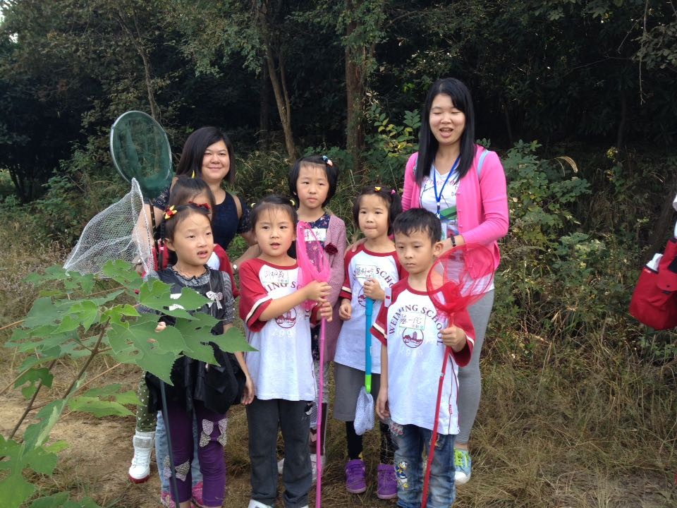 掰着手指等,我们终于盼到了周六。9点钟以前,大家都如约而至,聚集在武汉光谷为名实验学校的大门口。家长来了,同学来了,同学的弟弟妹妹来了,同学的邻居也来了。每个孩子手上都拿着网,有白色的,黑色的,深绿的,粉色的;有长的,短的,粗的,细的;有捕鱼的,有网虾的,有捉昆虫的。据了解这些网子来路很广,有在花鸟市场买的,有在爷爷家拿的,有在公园买的,有在网上购的,但都深信这网子的用途——能捉蝴蝶!