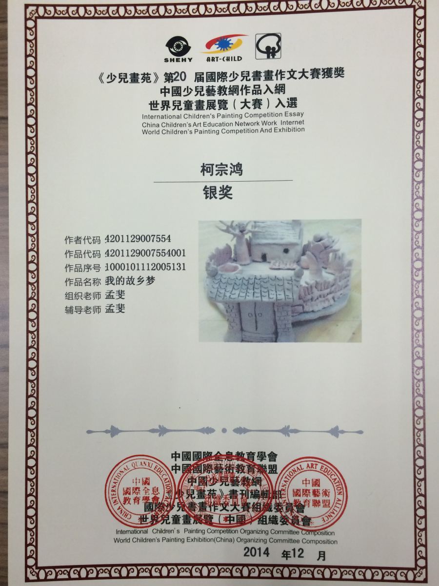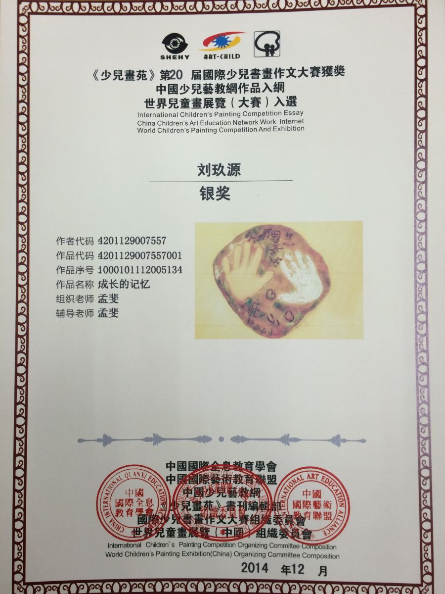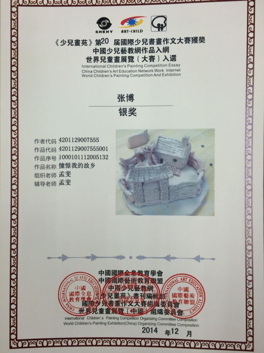 热烈祝贺我校六年级张博同学、柯宗鸿同学、一年级刘玖元同学、罗瑞诚同学分别在《少儿画苑》第20届国际儿童书画作文大赛荣获银奖和铜奖。