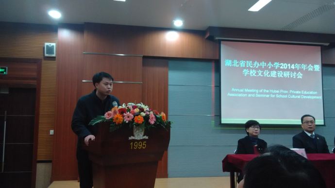 在会上,湖北省民办中小学教育协会副会长张维春女士传达了在海口召开的《中国民办教育发展大会暨中国民办教育协会2014年年会》重要精神,民办教育在中国教育所占比例越来越大,鼓励大家要与时俱进,改革创新,办高水平的民办学校。同时要认清形势,增强信心,分类管理,势在必行,把握机遇,提升品质。各类关于民办教育发展的法律和意见会相继出台,对民办教育的发展起到了保护和促进作用,民办教育的春天真正到来。