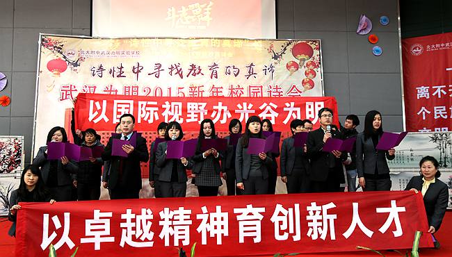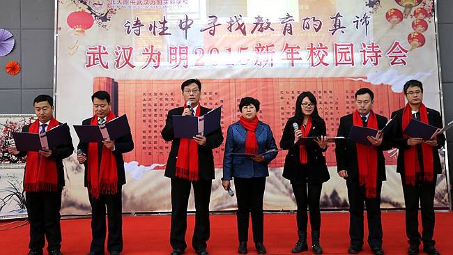 酣墨沾羊毫记载为明创业史,丹青赋春色描绘五年鼎新图。光谷为明满载着2014的丰收成果,迎来了充满希望的2015年。 2月28日,在新年开学之际,武汉东西湖、光谷两个校区的441名教职员工,相约武汉为明实验学校,隆重召开为明2015新学期教职工大会暨 “诗意中寻找教育真谛——武汉为明2015校园迎新诗会”。