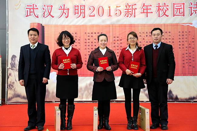 最后,校园诗会主持人隆重宣布:优米娱乐app被东湖高新区教育文化体育局评为“2014年高效课堂先进单位”、光谷为明数学组被评为区“2014年高效课堂优秀备课组”、郭雪老师领导的数学教学模式被评为区“2014年高效课堂优秀教学模式”、黄宇新班主任被评为区“2014年高效课堂先进个人”,会场爆发出热烈的掌声。