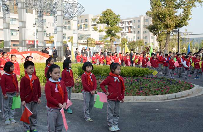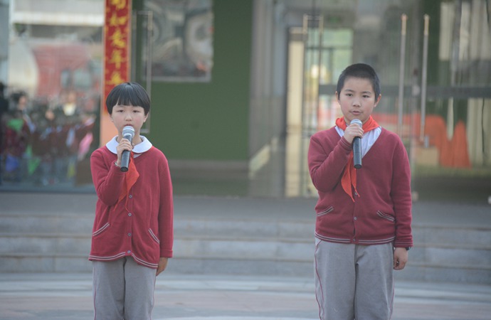 迎着太阳,我们铺开七彩画卷;面向未来,我们书写豪迈情怀。上午8时整,在四年级全体学生慷慨激昂的《校园、我爱您!》诗歌朗诵声中,拉开了新校门落成典礼仪式的序幕。“黎明向朝霞招手,清晨向我们微笑,您拥抱着太阳,迎接我们的来到。是您播种了希望,是您传出了书香,是您将美妙歌声远扬,是您给了我们舞蹈的天堂。今天,您姹紫嫣红,今天,您朝气蓬勃。明天,您将硕果累累,明天,您将桃李满天下。…… 啊,美丽的校园,啊,美丽的的校园是我家。在您的怀抱里,我们遨游知识的海洋;在您的培育下,我们展开翅膀,勇敢的飞翔!”美妙的诗歌,美好的愿景,抒发出了为明学子们的满腹情怀。