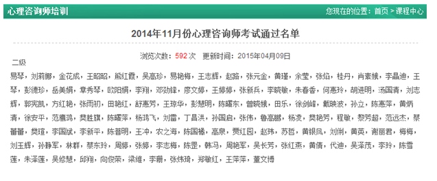 2015年4月9日,“2014年11月的心理咨询师二级考试结果”终于浮出水面!我校桂丹、肖素娥老师顺利通过了!
