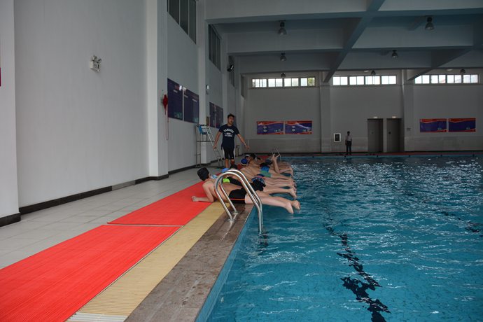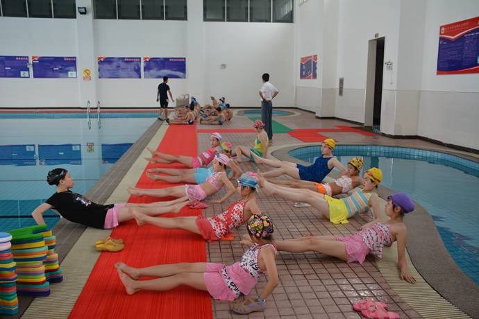 排着整齐的队伍,大家抑制不住内心的兴奋出发了。洗浴完毕,穿好泳衣,戴好游泳装备,男女生分别在教练的带领下做游泳前的准备活动。