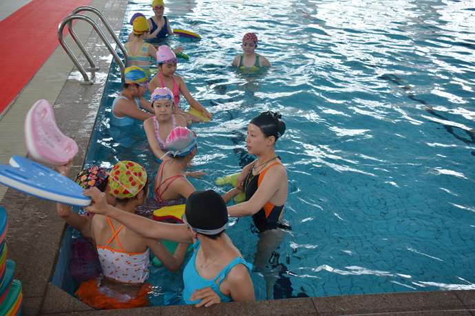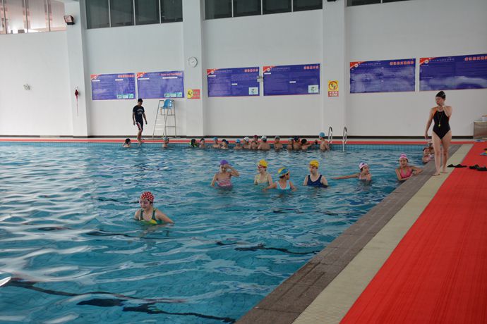 老师根据学生的游泳水平将学生分组。对不会游的同学,老师先让他们沿着水池行走,适应泳池环境,再练习水中憋气,逐步提升训练难度,让学生掌握初步的游泳技巧。对于已经会游的同学,老师重在加强他们游泳基本功,并开展一些趣味游泳比赛。洗漱完毕,喝上一杯浓浓的姜汤,大家依依不舍地离开游泳馆。