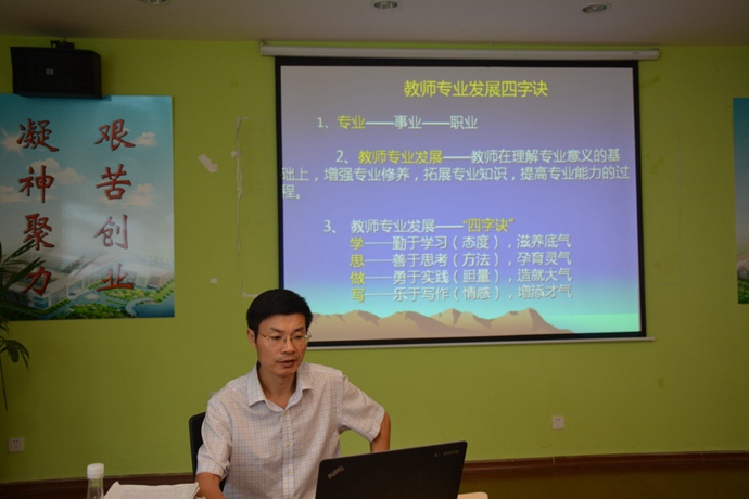 学校领导还特别邀请了东湖新技术开发区教育发展研究院的夏循藻院长为全体教师作了《教师专业发展“四字诀”》的课程培训,夏院长通过风趣幽默而文采飞扬的授课方式紧紧抓住了老师们的心弦,阐述了教师专业发展的四字诀:学、思、做、写。鼓励老师们要多读书读报、要敢于思考反省、要积极实践行动、要善于编写编撰。