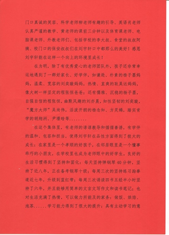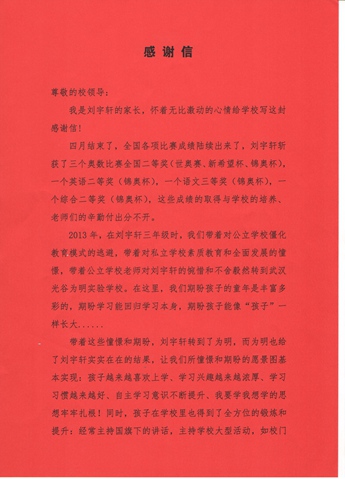 刘宇轩的妈妈说,三年前,他们带着对私立学校注重孩子素质教育和全面发展的憧憬,离开了公立学校,来到了光谷为明。三年多以来,学校领导及老师对孩子在学习上悉心教导、生活上细致关怀,特别是对于孩子在刚来学校的适应期间,老师们的循循善诱,“妈妈式的爱和关心”,以及对孩子取得点滴进步的鼓励和表扬都让孩子越来越喜欢上学,学习习惯越来越好,学习成绩也是突飞猛进,“我要学、我想学”的思想牢牢根植在孩子的内心之中。与此同时,武汉光谷为明学校的老师们爱岗敬业的精神、认真负责的态度让她深受感动,老师们不仅让孩子取得了优异成绩,更培养了他勇于探索、善于思考的优质品格,以及富于爱心、积极乐观的生活态度。这种“为明精神”是值得孩子受用一生的宝贵财富。