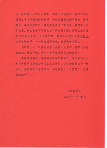 黄校长对刘宇轩同学能够通过不懈的努力,取得如此优异的成绩向家长表示了祝贺,同时表示,家长的认同是对学校和老师最大的肯定与鼓励,锦旗不仅是褒奖和激励,更是责任和鞭策!我们将在今后的教育教学工作中,百尺竿头更进一步, 努力将我校打造成具有国际水平的优质学校,为将孩子培养成“具有中国灵魂和世界眼光的现代人”而不懈努力奋斗!
