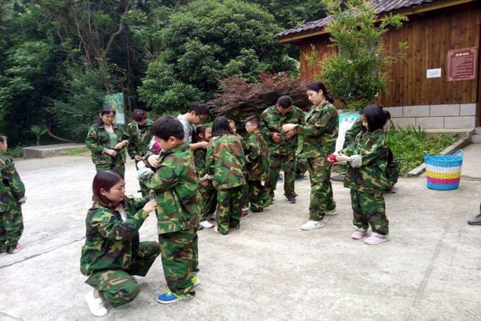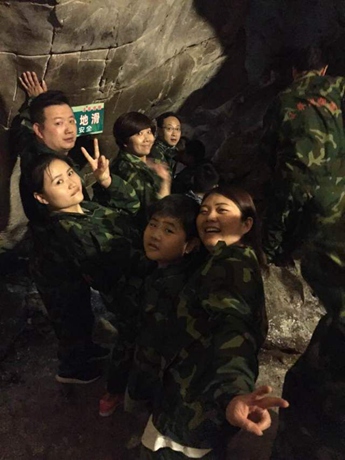 观光车行走在蜿蜒的林间小路,穿越茂密的树林,沿途杏花、桃花次第开放,松柏、冬青成片而生。孩子们一路都在兴奋地谈论着王莽洞里一定盘踞着一条巨大的蟒蛇,顿时一股阴冷的寒气油然而生。车行至服务区,大人小孩均要求换上迷彩服,虽然衣服不合身,还需用绳子固定裤子,平时爱美的那些女生也没有任何的怨言,一切听从安排。