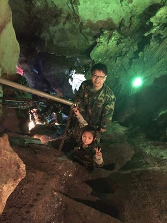 铁梯下行约二十米处,豁然开朗起来,一群黑蝙蝠迎面扑过来迎接大家的到来。再往前继续行走,曲径幽深深不可测。行至无路时,教练指着一处顺石壁下行的铁索,指挥大家依次紧抓住铁索滑动身体,攀岩而下。洞内常年不见天日湿滑无比,脚下完全无站稳之地。此时大人和孩子们都不敢贸然行动,教练先给大家做示范,孩子们依次缓慢滑下来,虽然路面狭窄,道路湿滑,行进过程中困难重重,但没有一个孩子叫苦,或中途退缩的,孩子们你们很勇敢,不仅战胜了恶劣的环境,更战胜了自我。在大家的共同努力下我们顺利地度过了第二关。