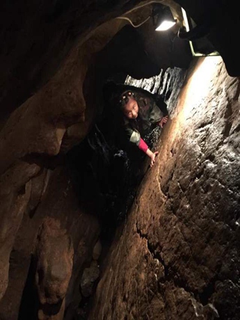 继续上行,洞内有的地方十分狭窄,很难通过,需弯曲身体,猫腰而过。王婷、赵梓涵等同学个子娇小,可以任意弯腰穿梭甚至是在石缝中歇息停顿。