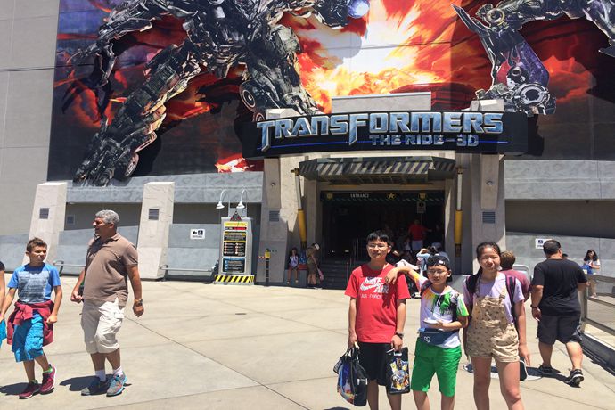 这里人真多呀,我们大概排了一小时的队。这是好莱坞环球影城独家开展的世界上最壮观、最惊心动魄的3D体验之一。 是一段模拟下一代惊险刺激的战车穿越,期间会受到霸天虎的袭击,更有擎天柱英勇的营救,穿越的骑乘带你在现实和虚幻来回体验穿越。将真映像三维高清晰媒体、惟妙惟肖的飞行模拟技术和世界上先进的物理与特技效果完美结合,将人体的感官体验提升到极致,属于最新一代的主题公园体验性游艺项目。您将置身于威震天、擎天柱、大黄蜂和EVAC之间的殊死决战。体验之后,我们真得觉得不虚此行。