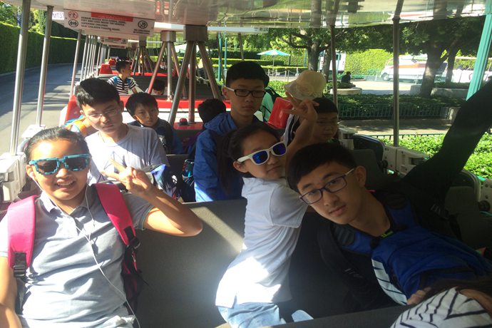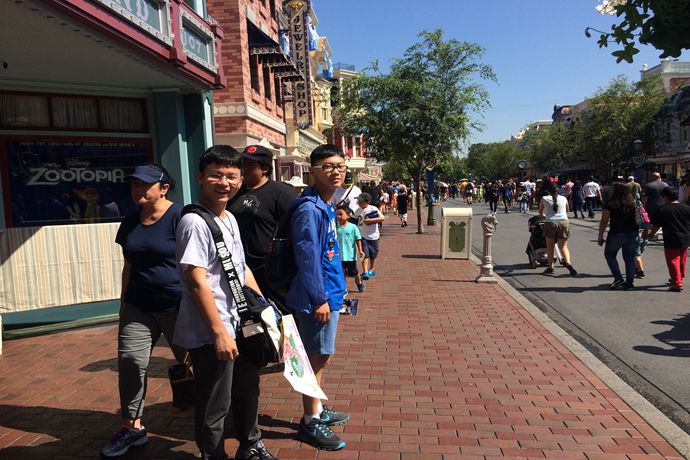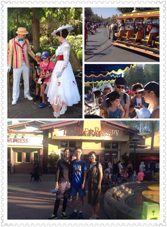 从学校驱车前往迪士尼,我们差不多半个多小时的时间就到了。大巴停在停车场,我们要坐乐园里的电车到大门口。进入大门首先映入眼帘的是一条笔直的道路,路面上铺着各种复古式的砖块,道路两旁都是各种店铺,路中央还分布着圆形的花坛,里面盛开着各种颜色艳丽的花朵,不时的有米奇、米妮、唐老鸭的玩偶走过向我们打招呼,乐队吹着欢乐的乐曲,迈着整齐的步伐,仿佛带我们走进了奇妙梦幻的迪士尼国度!
