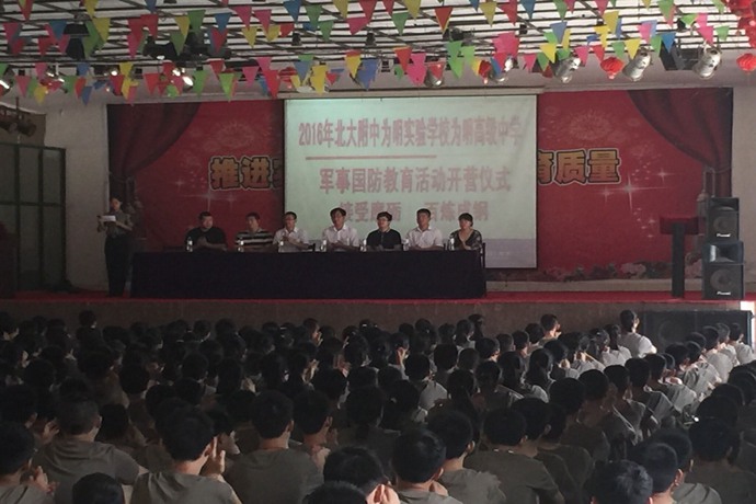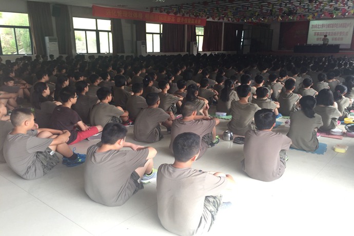 开营仪式,教官严格要求学生行列整齐,坐正挺直,鼓掌有节奏。