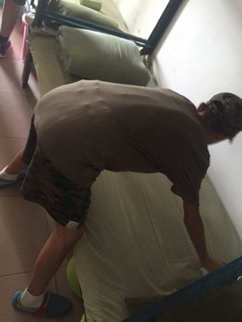 午餐以后整理内务,这让平时衣来伸手饭来张口的孩子们无从下手。教官讲解要求,鞋、桶、洗漱用品放在规定位置,成一条直线,被子叠成方块,床单用衣架抹平。然后教官示范折叠被子,孩子们模仿得有模有样,很不错哦!