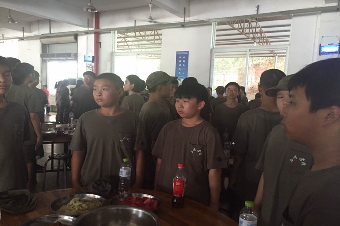 吃饭是孩子们喜欢的事情,但是在训练基地,吃饭可不是件容易的事情。排队进场,军姿站立于桌旁,五秒坐下,保持安静进餐,全场700人左右,鸦雀无声。迅速吃完以后,学生自己收拾桌子,倒剩菜,擦桌子,洗盘子,分工合作,积极团结。